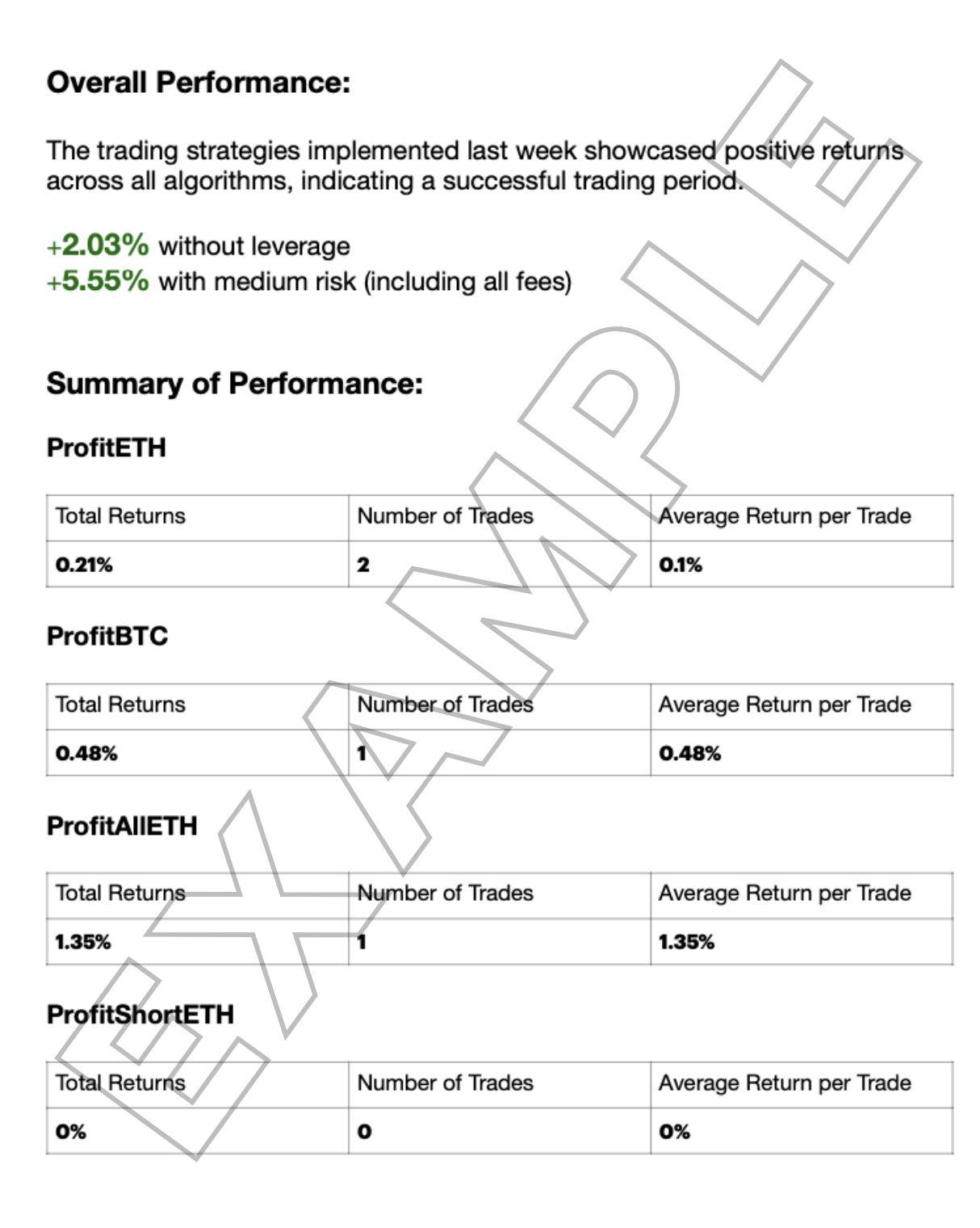 Receive comprehensive weekly reports on your trading performance and market conditions.